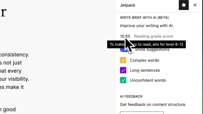 With this tool, WordPress guides users in refining their prose, indicating when descriptions are overly verbose and offering a “Suggest” button to instantly simplify any sentence.