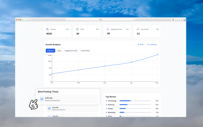Monitoring Bluesky performance is a key feature of this service, as BlueSkyHunter provides various metrics and visualizations in its dashboard. Users can track total follower counts, monthly posts, engagement rates, growth trends, optimal posting hours, primary niches, topic engagement, and more. Data can be filtered for daily, weekly, monthly, quarterly, or all-time insights.