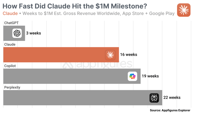 However, Claude managed to surpass other AI app rivals in the race to $1 million in revenue, despite trailing significantly behind ChatGPT, which achieved the milestone in just three weeks. Claude outperformed Microsoft’s Copilot and Perplexity, which required 19 and 22 weeks, respectively, to reach the revenue benchmark.