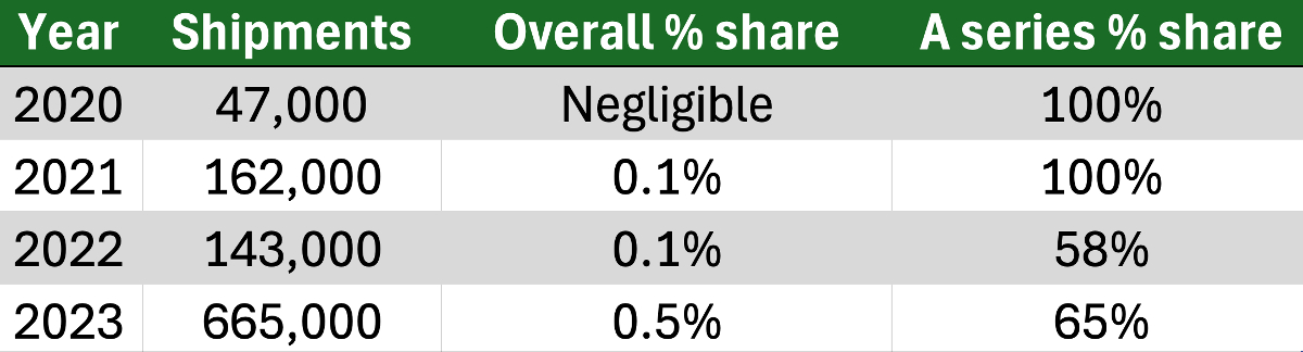 Google’s smartphone deliveries in India saw an extraordinary year-on-year increase of over 1,300% in 2023, soaring to 665,000 units from just 47,000 in 2020, as exclusively reported to TechCrunch by IDC. Nevertheless, Google’s share in the vast smartphone market of India remains modest at 0.5%, with the Pixel A series constituting 65% of its sales in 2023.