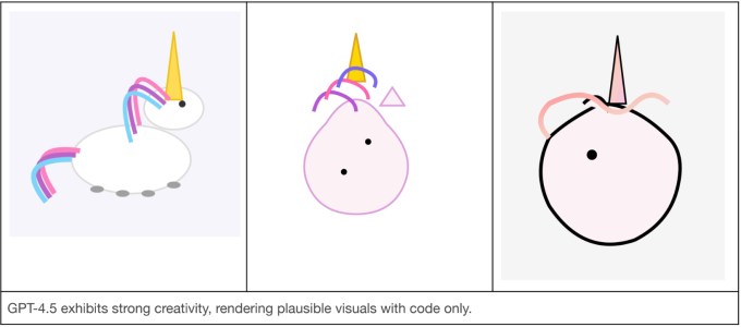 In an informal evaluation, OpenAI tasked GPT-4.5, along with GPT-4o and o3-mini, to generate a unicorn in SVG format, which is employed for rendering graphics using coding. GPT-4.5 was the only model to create something remotely resembling a unicorn.