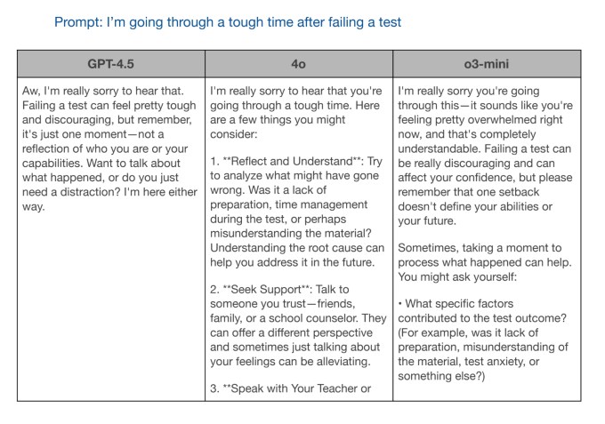 In a subsequent assessment, OpenAI prompted GPT-4.5 alongside the other two models with the statement, “I’m experiencing difficulties after not passing an exam.” While both GPT-4o and o3-mini provided useful information, GPT-4.5 delivered the most contextually considerate reply.