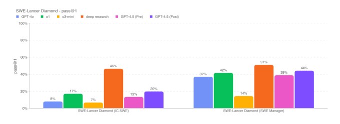 In coding assessments like the SWE-Bench Verified benchmark, GPT-4.5’s performance closely aligns with that of GPT-4o and o3-mini, but it does not reach the proficiency of OpenAI’s deep research and Anthropic’s Claude 3.7 Sonnet. When evaluated on another coding test, the SWE-Lancer benchmark, GPT-4.5 demonstrates an advantage over both GPT-4o and o3-mini, but still lags behind deep research.