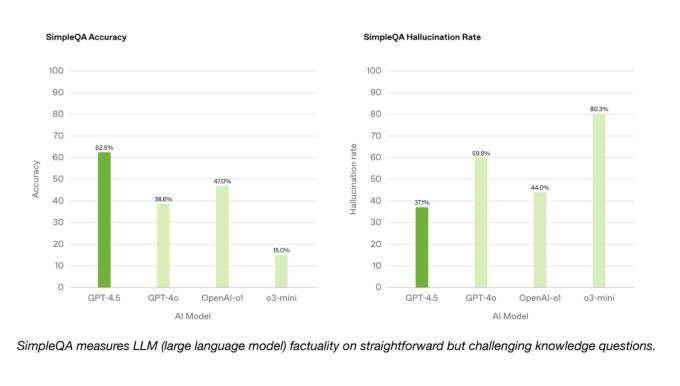 According to OpenAI’s SimpleQA benchmark, which evaluates AI models on straightforward factual questions, GPT-4.5 outshines GPT-4o and OpenAI’s reasoning models, o1 and o3-mini, in accuracy. OpenAI claims that GPT-4.5 has a reduced tendency for hallucinations compared to most models, implying a lower likelihood of fabricating information.