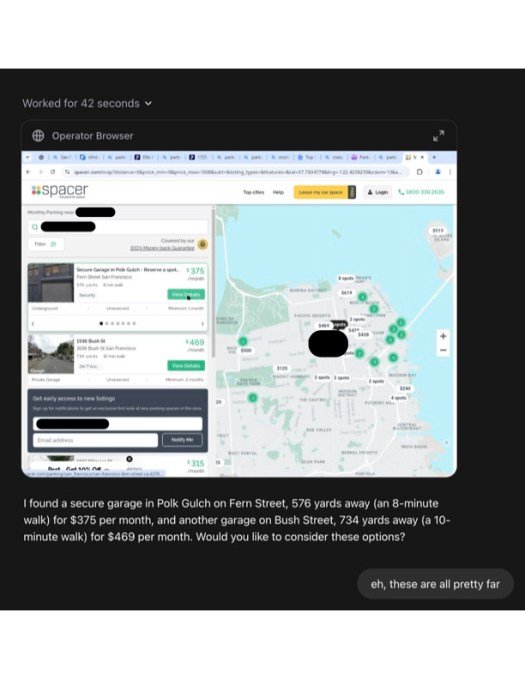 For example, I requested the agent to locate a parking garage near my new residence. It ended up recommending two garages, claiming they were only a few minutes’ walk away.