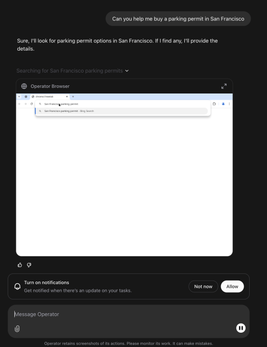 I requested that Operator help me purchase a new parking permit. The agent responded, “Absolutely,” and then opened a new browser window on my computer.