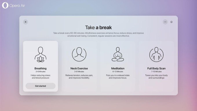 Opera has created a variety of guided breathing exercises, neck stretches, meditations, and full-body scans for breaks. Users can select activities based on their desired duration and type of exercise.