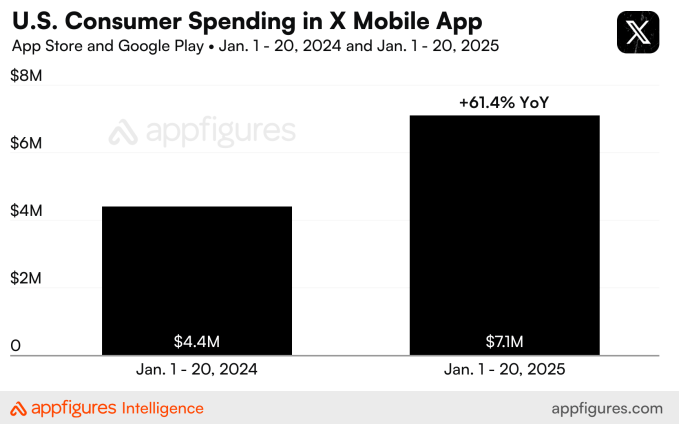In the United States, consumer spending on X’s iOS and Android platforms grew by 61.4% year-over-year, rising from $4.4 million between January 1-20, 2024, to $7.1 million during the same timeframe in 2025.