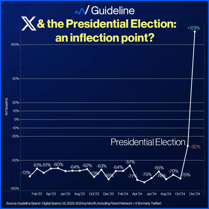 While Appfigures and Sensor Tower’s data emphasizes consumer spending, there are also hints that X’s advertising sector is experiencing a resurgence. Ad spend data provider Guideline noted a 123% increase in ad spending for X in December 2024, after a decline of 32% in November, following two years of significant reductions ranging from 60-80%.