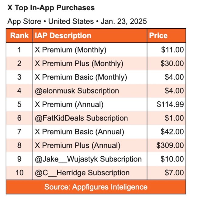 During January 2025, the top in-app purchases on the X iOS app were as follows: the X Premium Monthly subscription ($11/month) took the top spot, followed by the X Premium Plus Monthly subscription ($30/month), X Premium Basic Monthly ($4/month), a subscription to Elon Musk’s account ($4/month), and the X Premium’s Annual Subscription ($114.99/year).