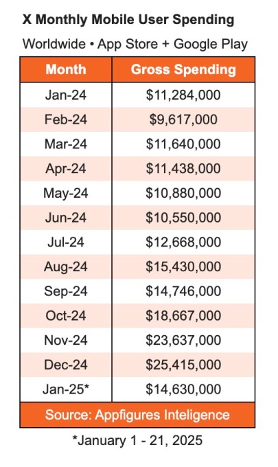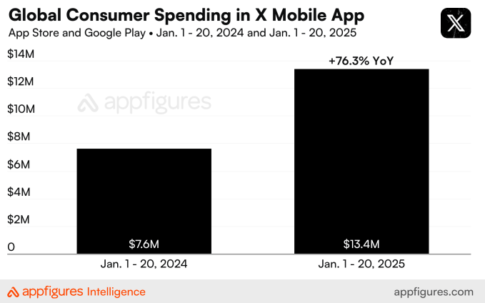 According to an analysis conducted by Appfigures, global consumer spending on X’s apps for iOS and Android totaled $7.6 million from January 1-20, 2024. By the same time in January 2025, this figure had risen to $13.4 million, the firm noted. This revenue comprises in-app purchases made through X’s mobile applications, excluding revenues generated from advertising or web-based subscriptions where users can obtain discounts.